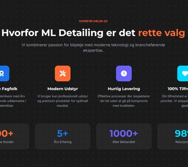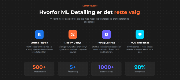 Udgangspunktet var enkelt: En besøgende skulle kunne forstå, hvad ML Detailing laver, uden at få det forklaret. Billederne, strukturen og sproget skulle tale for sig selv. Derfor blev siden bygget op med få, tydelige elementer og et roligt flow, der giver plads til detaljerne.